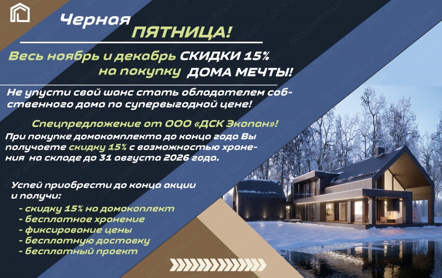 Специальное предложение от компании «ДСК ЭКОПАН»!  При покупке домокомплекта, вы получаете скидку -15%. В период проведения акции фиксируйте стоимость на 2026 год, оплата всего от 50% от стоимости — заключайте договор сейчас, а оплачивайте остаток с началом строительства. Все последующие повышения цены вас не коснуться. Торопитесь  построить свой дом с существенной экономией!